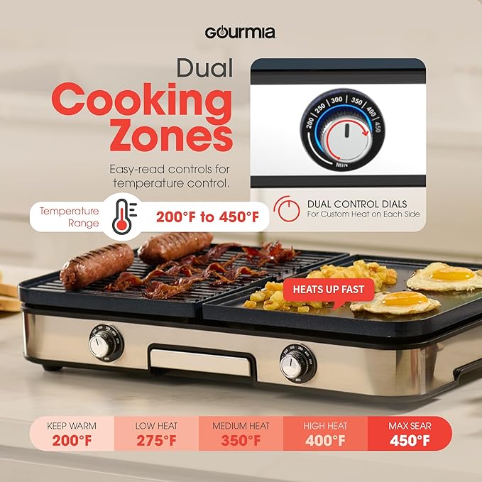 - FAST & EVEN HEAT DISTRIBUTION – 3-in-1 indoor griddle with precise temperature control (200-450 degrees), an easy read indicator light and 28″ x 11.5″ XL surface with fast heat-up for cooking delicious breakfast, lunch, or dinner.