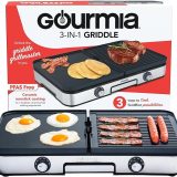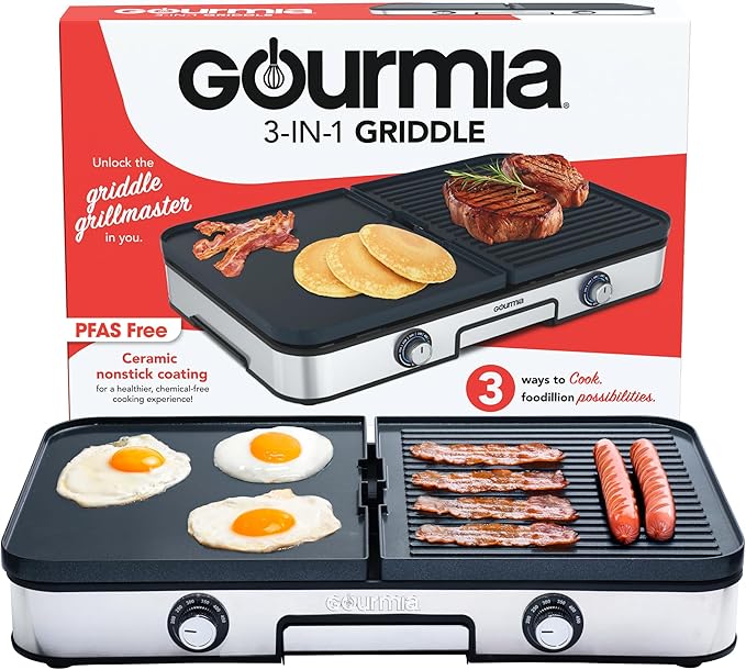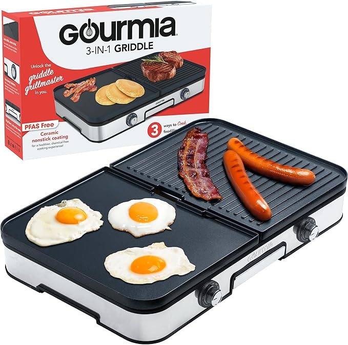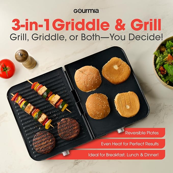 - 3-IN-1 GRILL OR GRIDDLE OR BOTH – Double-sided plates on this 3-in-1 flat griddle/indoor electric grill let you switch between using it as a grill, griddle, or combination. Grill up steaks, make fluffy pancakes, or do both at the same time!